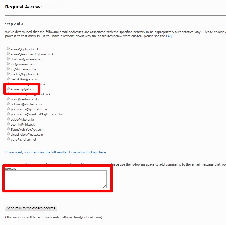 이메일 선택 항목에서 케이티 메일주소를 선택합니다. 그런 후 아래 공백에 한글로 메일 받은 사람이 알아볼 수 있게 근거를 남깁니다.