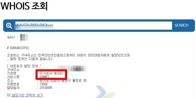 제가 테스트로 등록할 아이피를 조회하니 케이티로 나오네요.