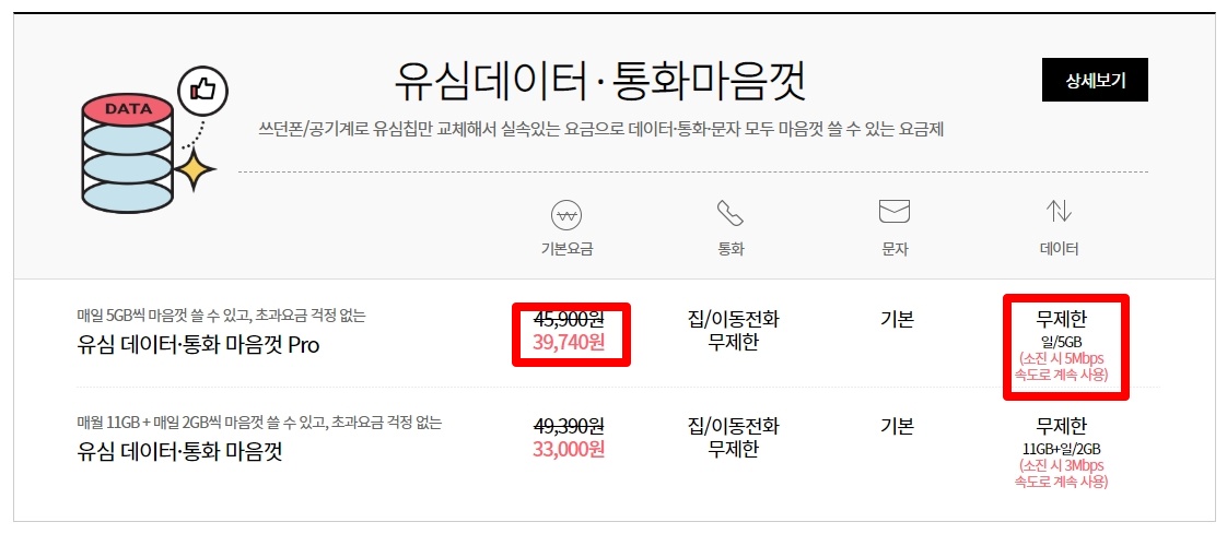 유심 데이터 통화 마음껏 pro 요금제