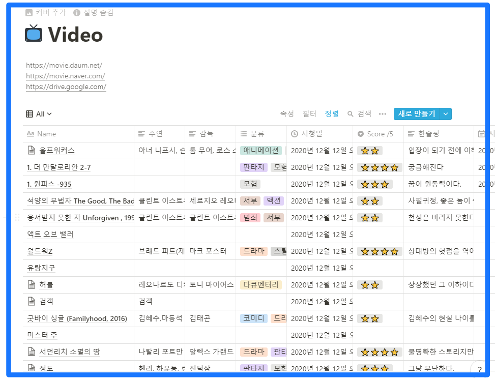 <개인적으로 감상한 비디오를 '노션'으로 정리한 모습>