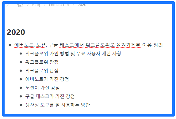 워크플로위에서 어떤 주제에 대해서 '목차'를 먼저 정리한다. 그런 후 에버노트에 해당 글을 작성한다.