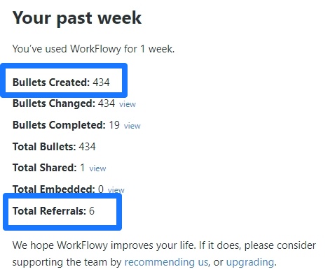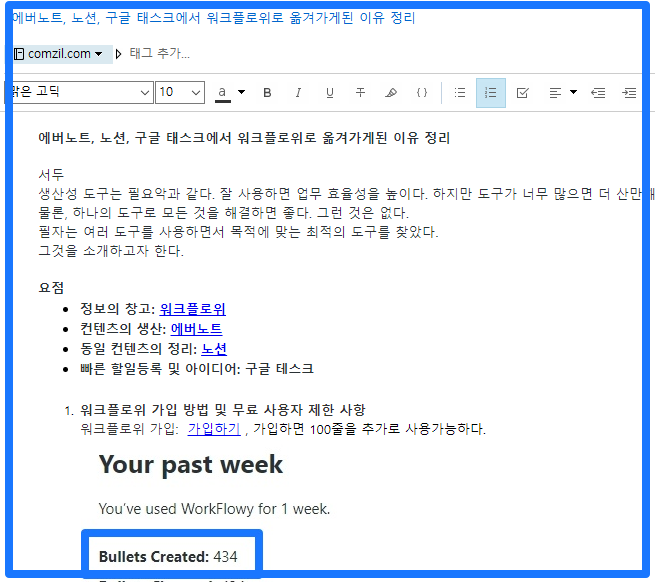 워크플로위 가입 후 1주 사용한 결과다. 무료사용자는 100불릿 제한이 있다. 434개의 불릿을 사용한 것을 볼 수 있다.
