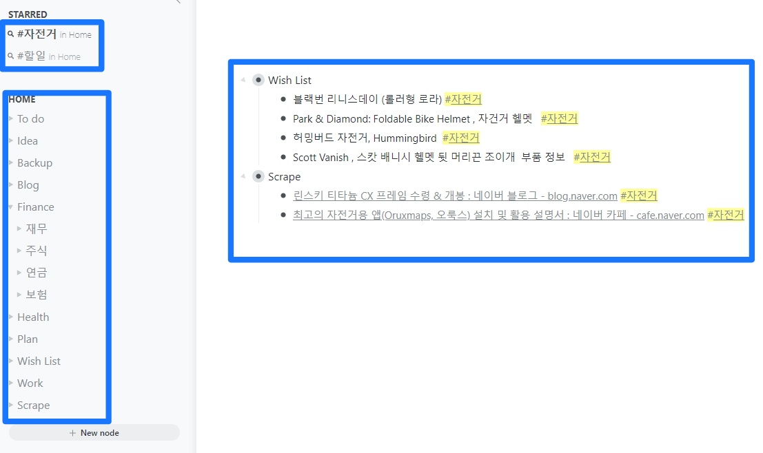 자전거와 관련된 글에 사전에 태그를 걸어 놓고 '자전거'란 태그로 검색을 해본 모습이다. 관련된 데이터가 어디에 있는지 한 번에 알 수 있다.