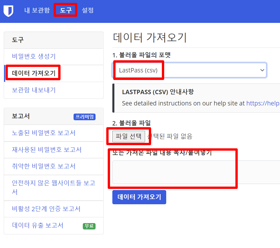 경로: 도구 - 데이터 가져오기 - 불러올 파일의 포멧(라스트패스 선택) - 파일 선택 - 데이터 가져오기
