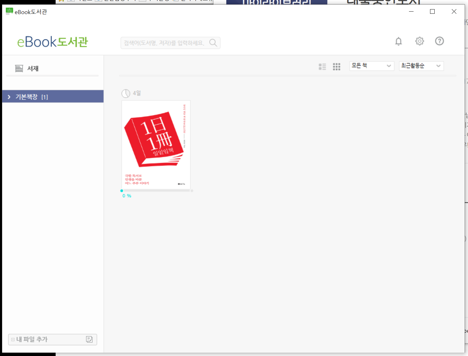다시 마이라이브러리에서 대출한 책을 '책읽기' 클릭하면 이북리더 프로그램이 실행된다.