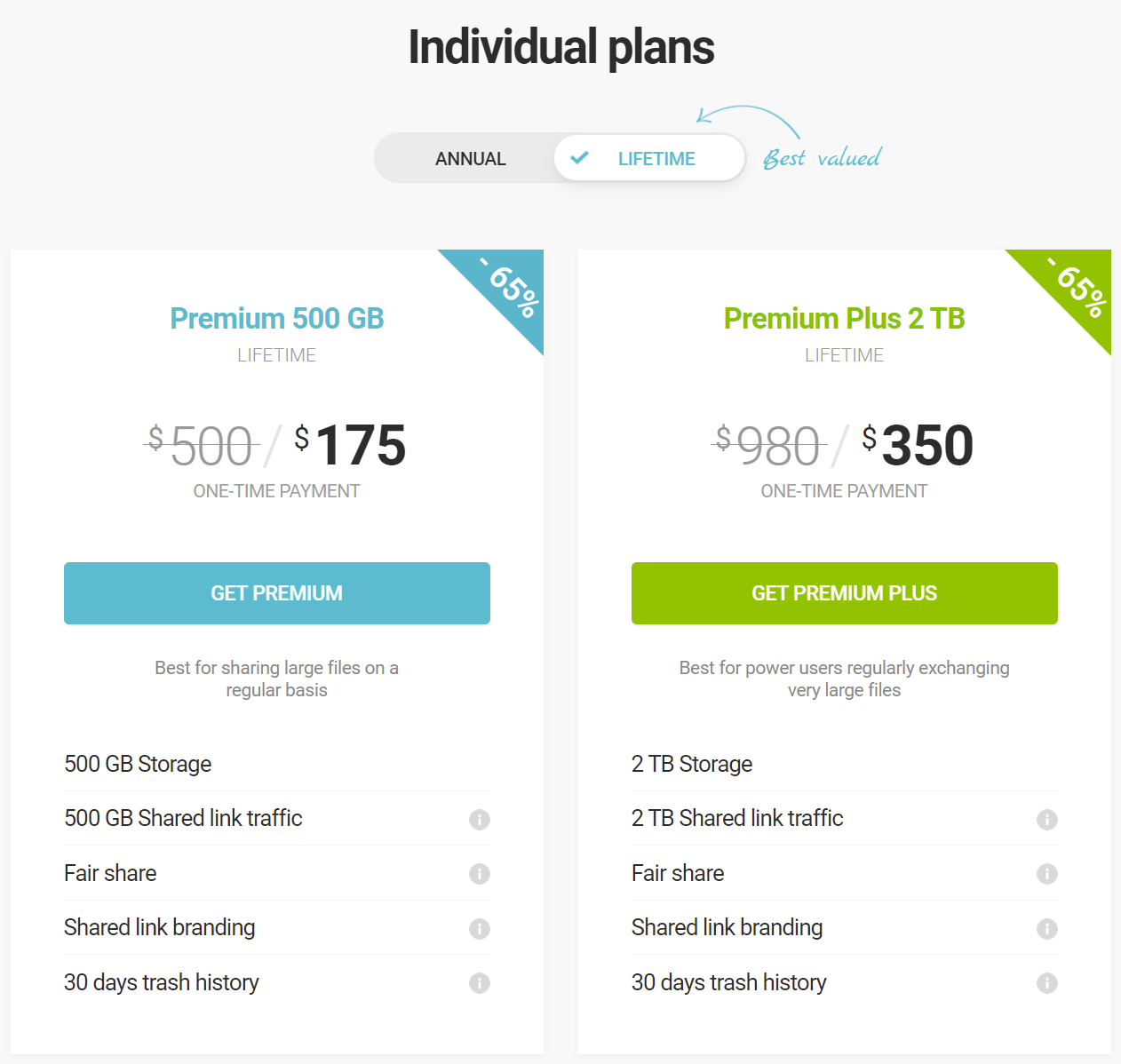 pcloud는 라이프타임 요금제가 있다. 350달러에 평생 2TB를 사용할 수 있다. 용량을 증설하고 싶으면 같은 가격으로 2배 증설도 가능하다.
