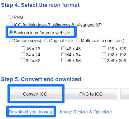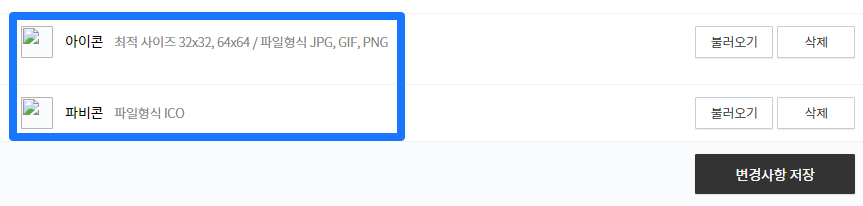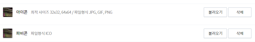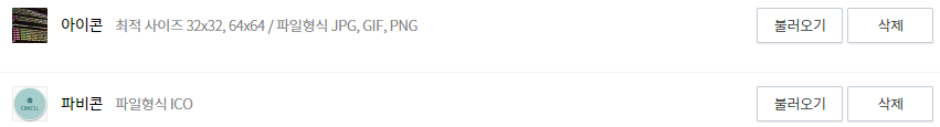 아이콘과 파비콘을 추가하는 화면이 있다. 이 중 중요한 것은 파비콘이다. 해당 사이트를 즐겨찾기하면 아이콘도 추가되는데 이때 사용되는 것이 파비콘이다. 개인이 ico 파일을 제작하는 것은 번거로운데 간편하게 제작해주는 사이트가 있다.