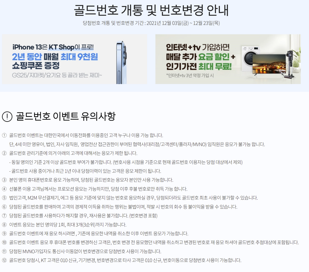 ⑫골드번호 당첨시, KT 고객은 010 신규, 기기변경, 번호변경으로 타사 고객은 010 신규, 번호이동으로 당첨번호 사용이 가능합니다.