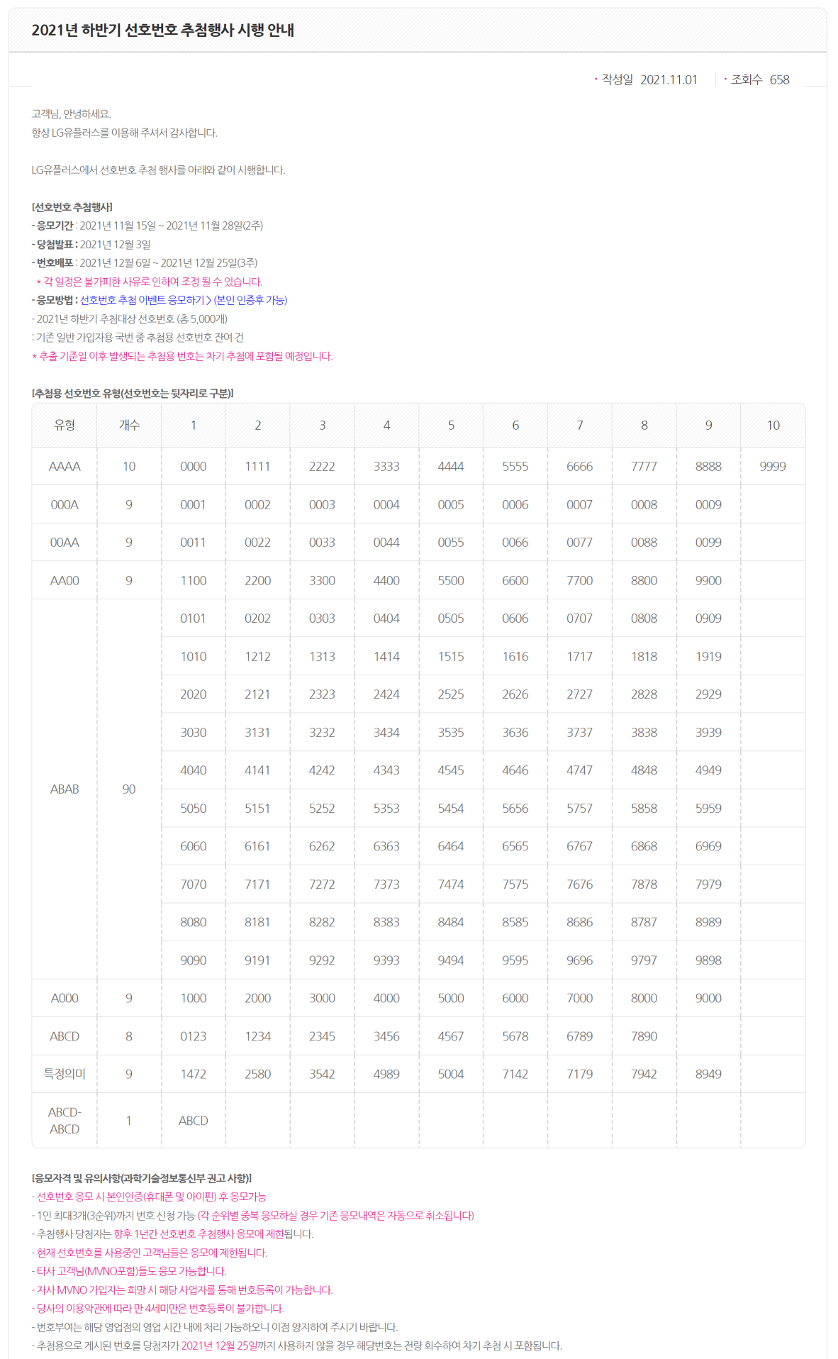 당첨번호 개통 및 번호변경 기간 : 2021년 12월 10일 ~ 12월 31일