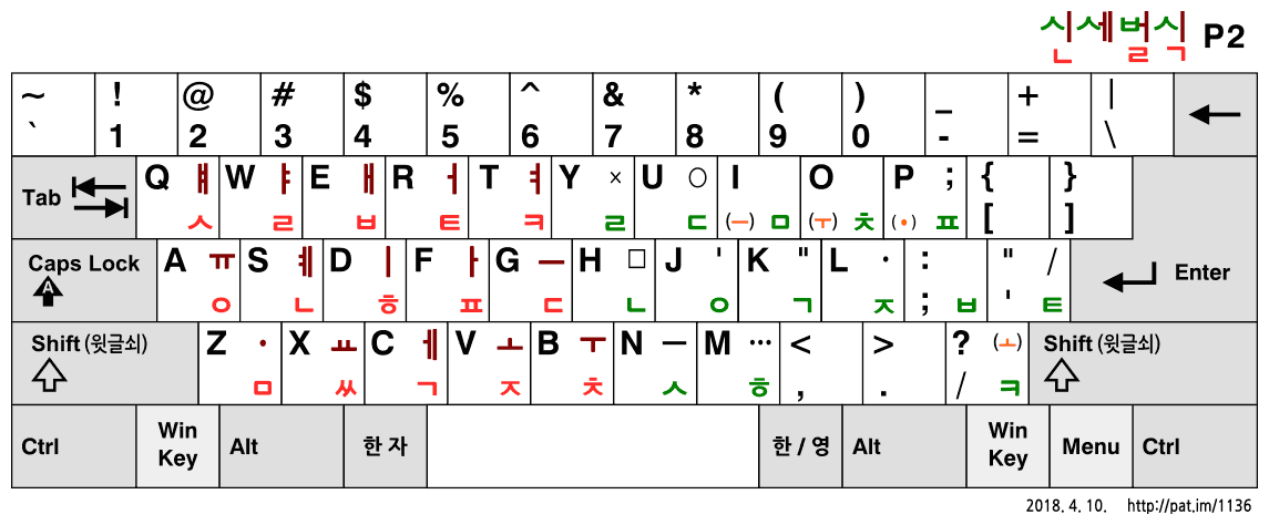 신세벌식P2는 P 버전과 알파벳 T, B의 초성, 중성, 종성이 상이하니 위 레이아웃 참고하여 수정하거나 아래 링크의 파일 참고