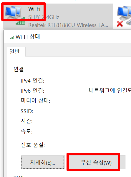 새로운 창이 실행되는데 '무선 속성(W)'를 클릭합니다.