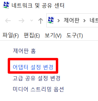 '제어판'에서 네트워크 부분이 실행될 것입니다. '어댑터 설정 변경'을 클릭합니다.