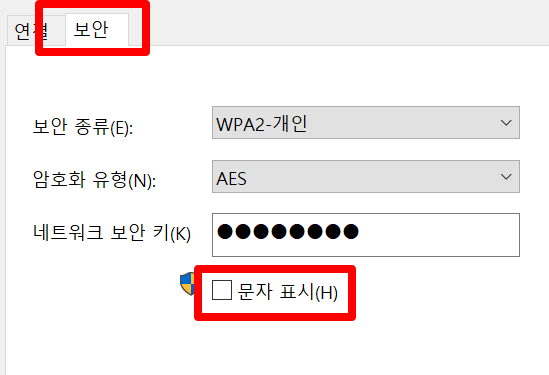 경로: 제어판 - 네트워크 및 인터넷 - 네트워크 및 공유 센터 - 어댑터 설정 변경 - Wi-Fi(더블클릭) - 무선 속성 - 보안 - 문자 표시