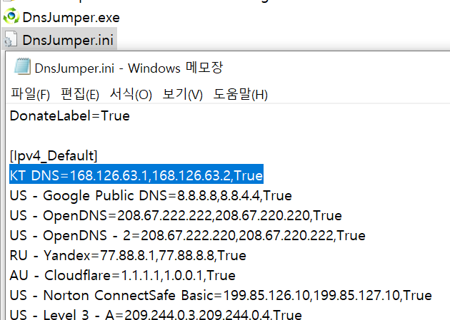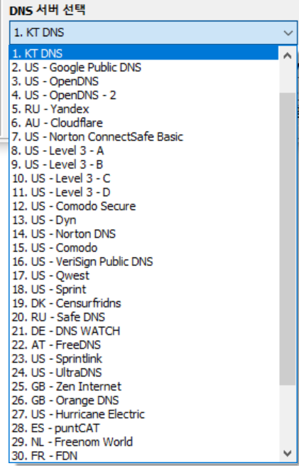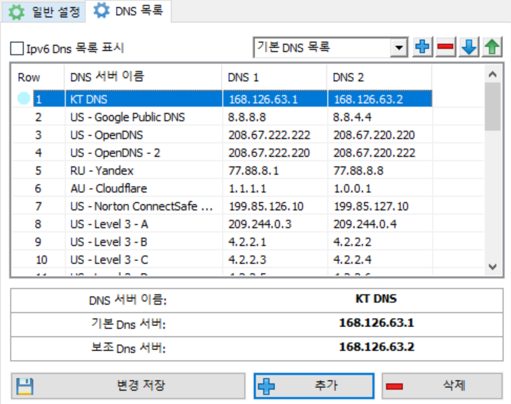 해외에서 제작된 프로그램으로 KT DNS가 빠져있습니다. '추가' 기능으로 추가를 해줍니다.