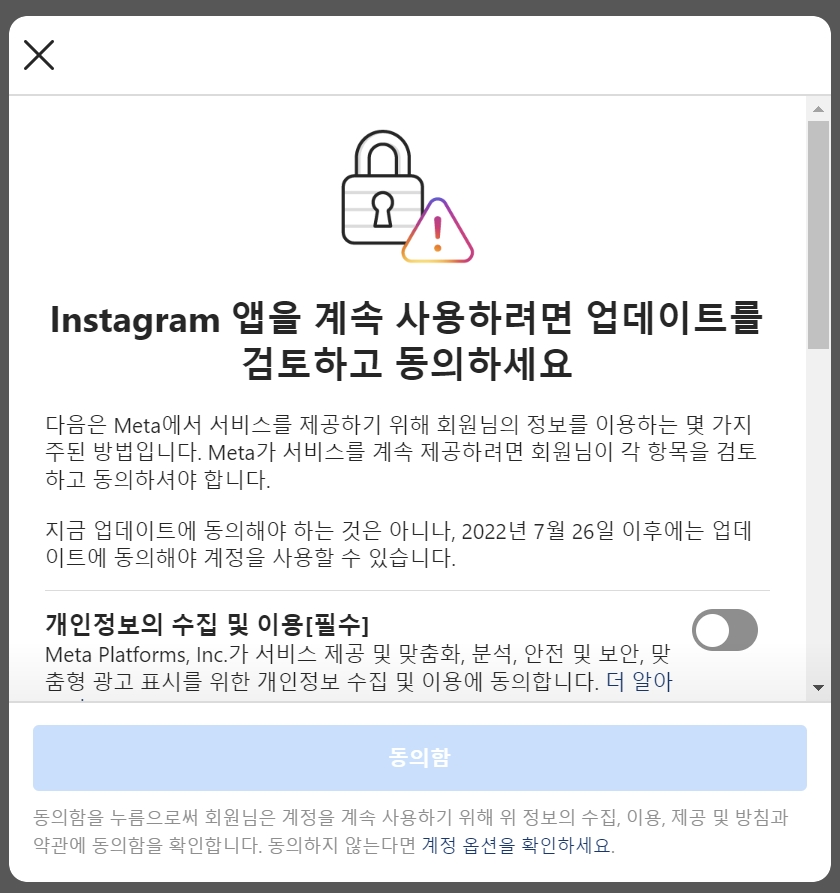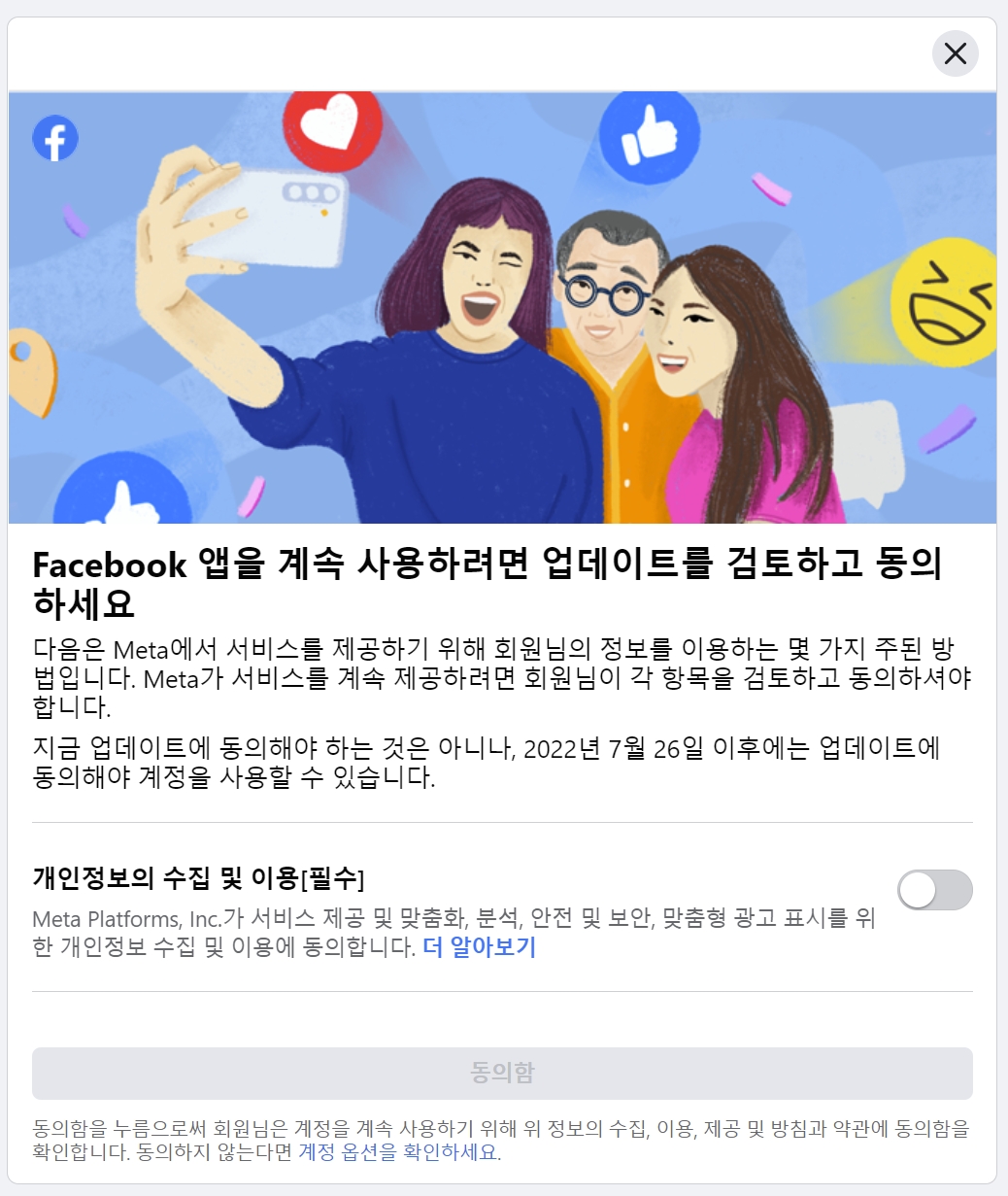 2022년 7월 26일까지 메타에서 개인정보 동의를 하라는 문구가 계속 뜨고 있습니다.