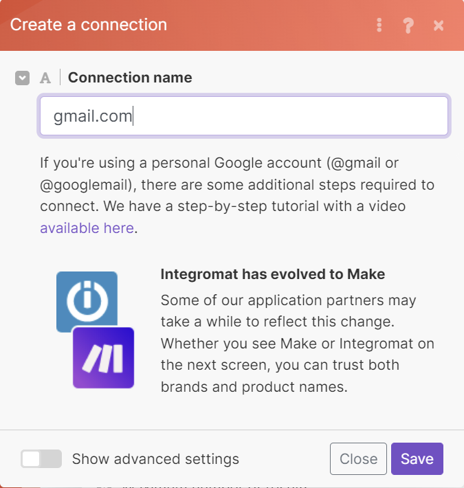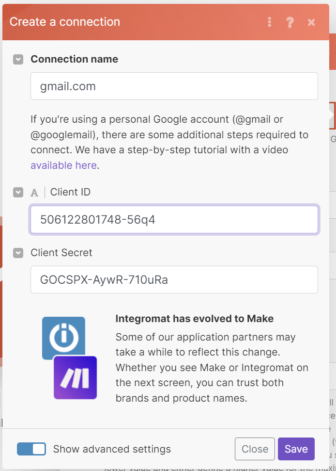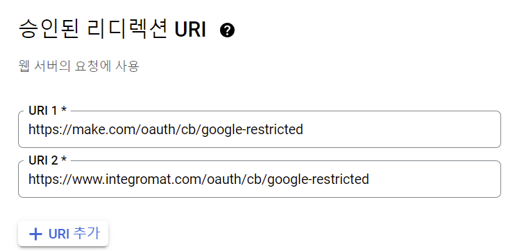 https://www.integromat.com/oauth/cb/google-restricted - 리디렉션 주소에 make가 아닌 이전 도메인 주소로 입력해야합니다.