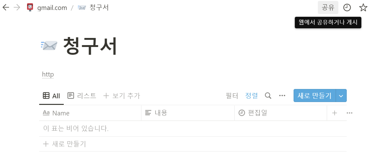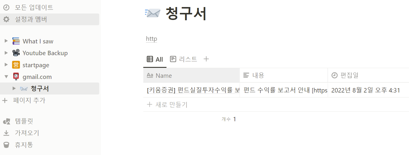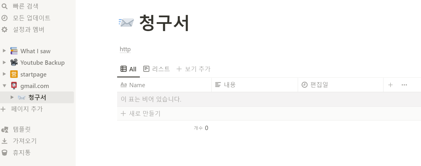 노션에도 ‘청구서' 폴더를 생성하고 등록될 데이터는 간단하게 ‘메일제목', ‘메일 본문' 정도를 설정하였습니다.