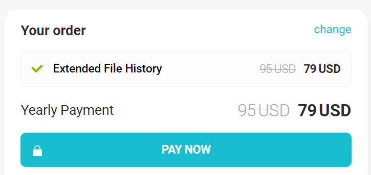 79달러 정도 하는군요. 평생이 아니라 파일히스토리는 매년 갱신이 필요한 요금제군요. 아무래도 1년치 데이터를 보려면 용량 압박이 있으니 비용이 많이 발생하는가 봅니다.