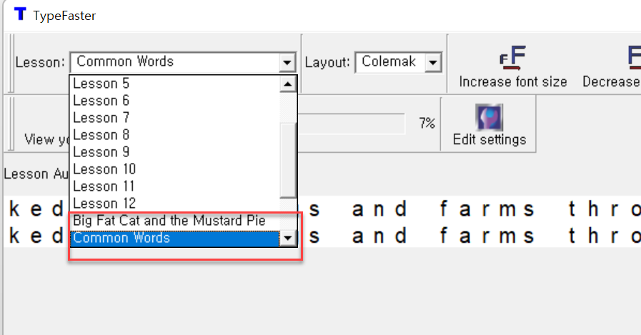 레슨을 순차적으로 독파하면 자판 배열 순서대로 연습 할 수 있습니다. 마지막 2개는 압축파일에 제가 임으로 넣은 것입니다. 빅팻캣 소설과 오마바 연설문입니다.
