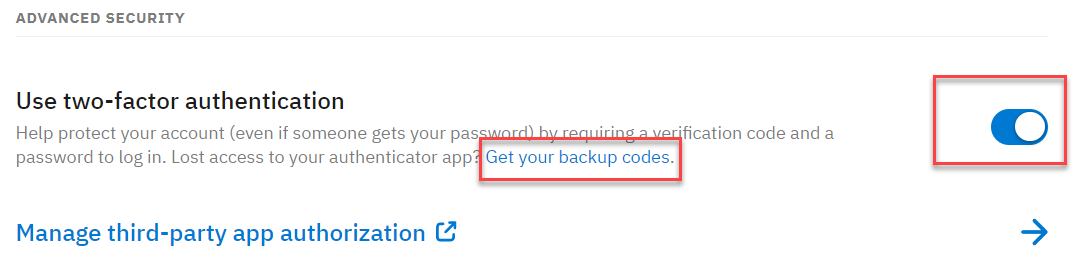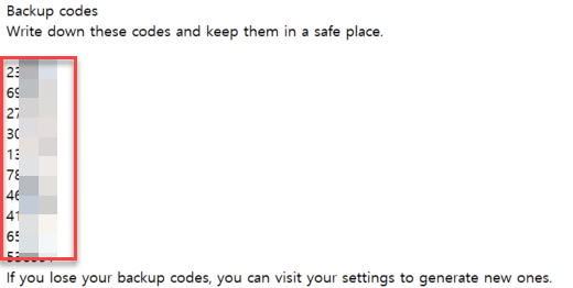 ‘Get your backup codes’를 클릭해서 랜덤 비밀번호를 어딘가에 저장해 둔다. ‘Google Authenticator’ 사용 불가 시 임시로 로그인이 가능하다.