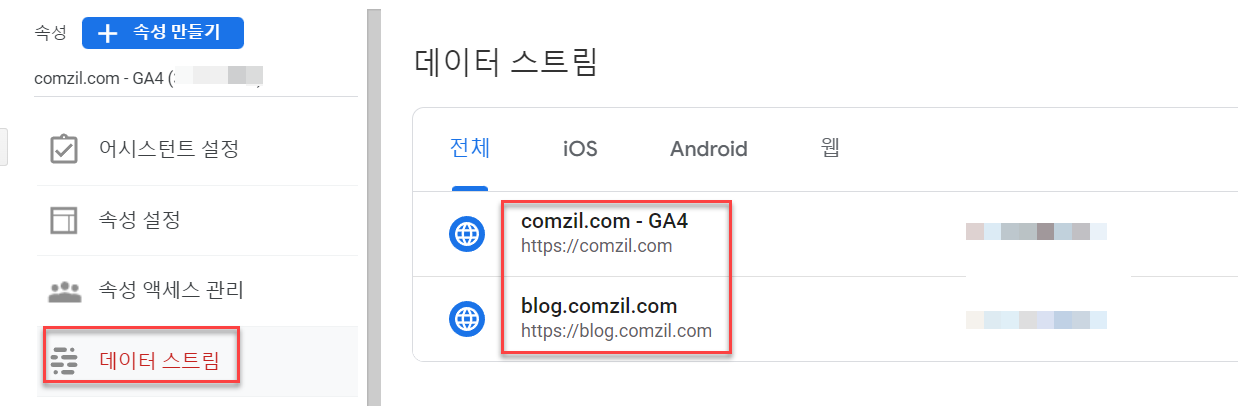 새롭게 분석 할 사이트가 있다면 ‘데이트 스트림'을 하나 더 추가하면 된다. 2개 추가 해 본 모습이다.