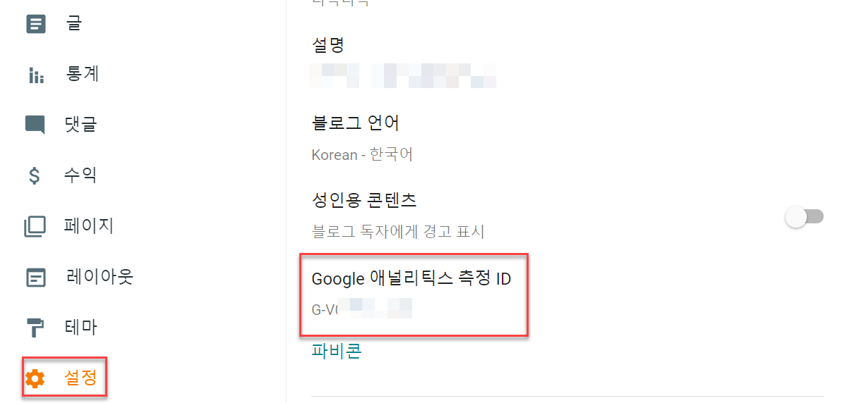구글 블로거(블로그스팟)에서는 ‘설정' 부분의 ‘구글 애널리틱스 측정ID’ 부분에 넣으면 된다.