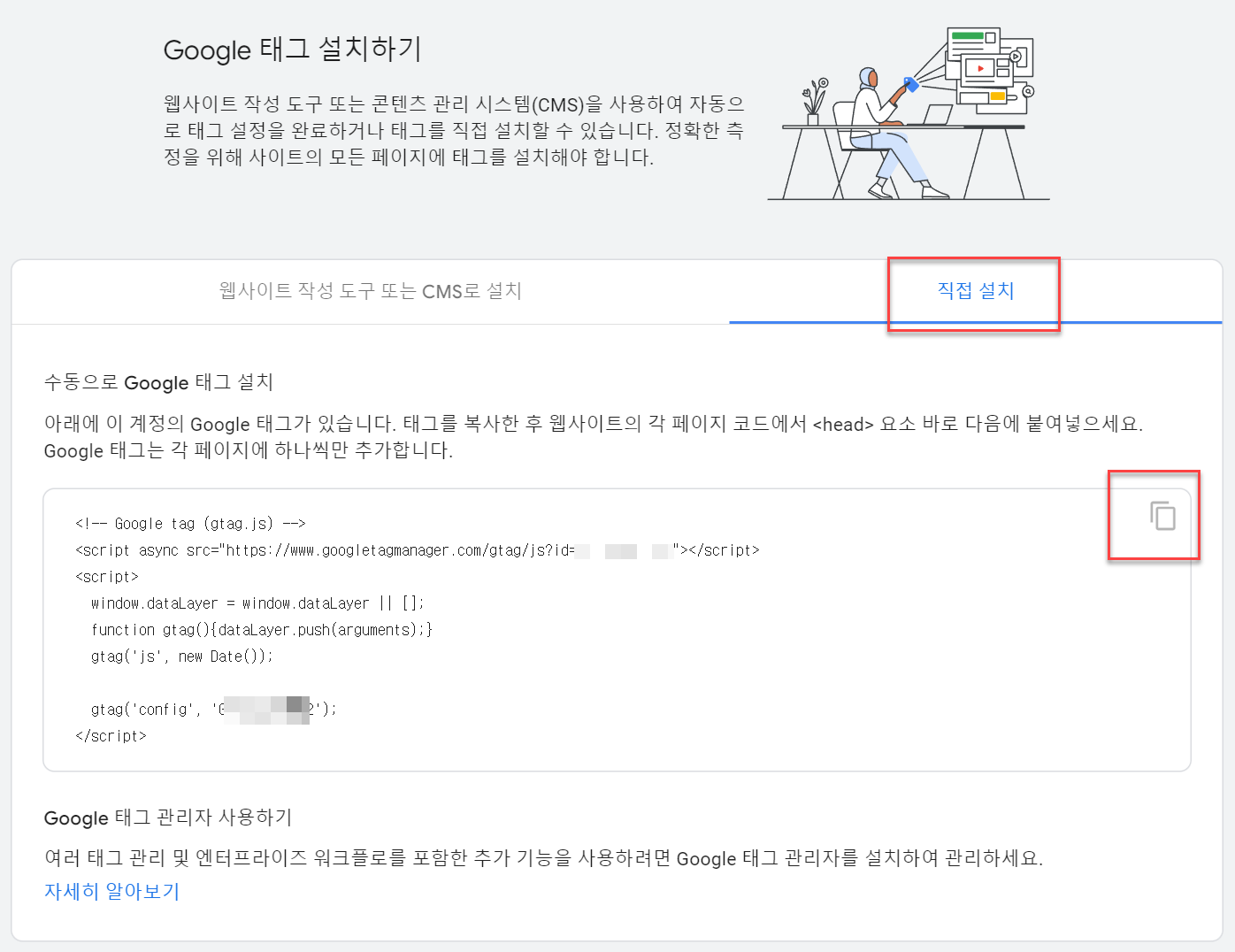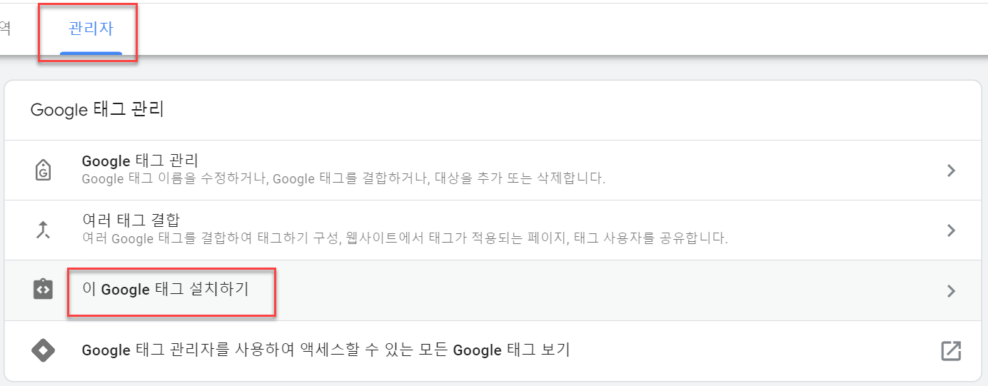 4. Google 태그 - 태그 설정 구성 - 관리자 - 이 Google 태그 설치하기 - 직접설치