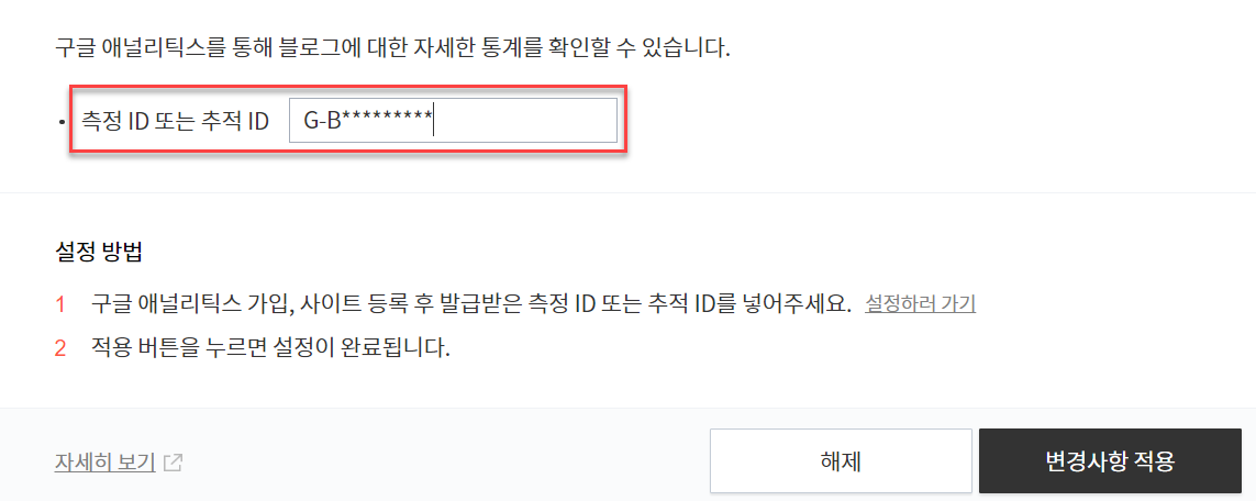 이 ‘측정 ID’를 티스토리나 구글블로거의 관련 메뉴에 넣으면 된다.
