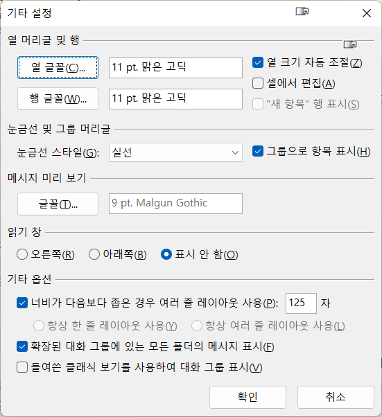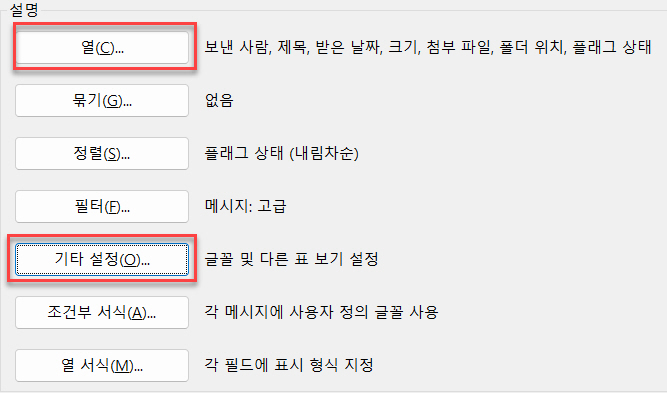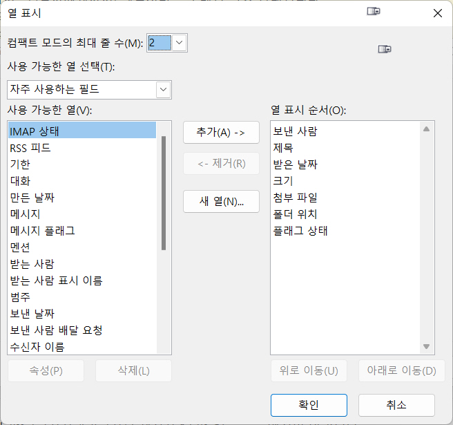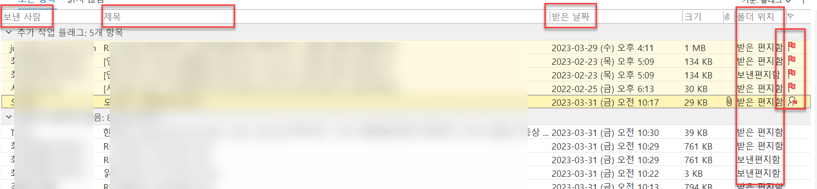‘플래그 상태'를 제일 상단에 두고 싶었지만 아웃룩 버그인지 플래그 정렬이 안된다. 그래서 끝에 위치