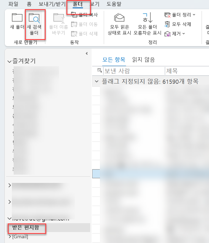 해당 계정의 ‘받은 편지함'을 선택하고 ‘폴더' - ‘새 폴더 검색'을 클릭한다.
