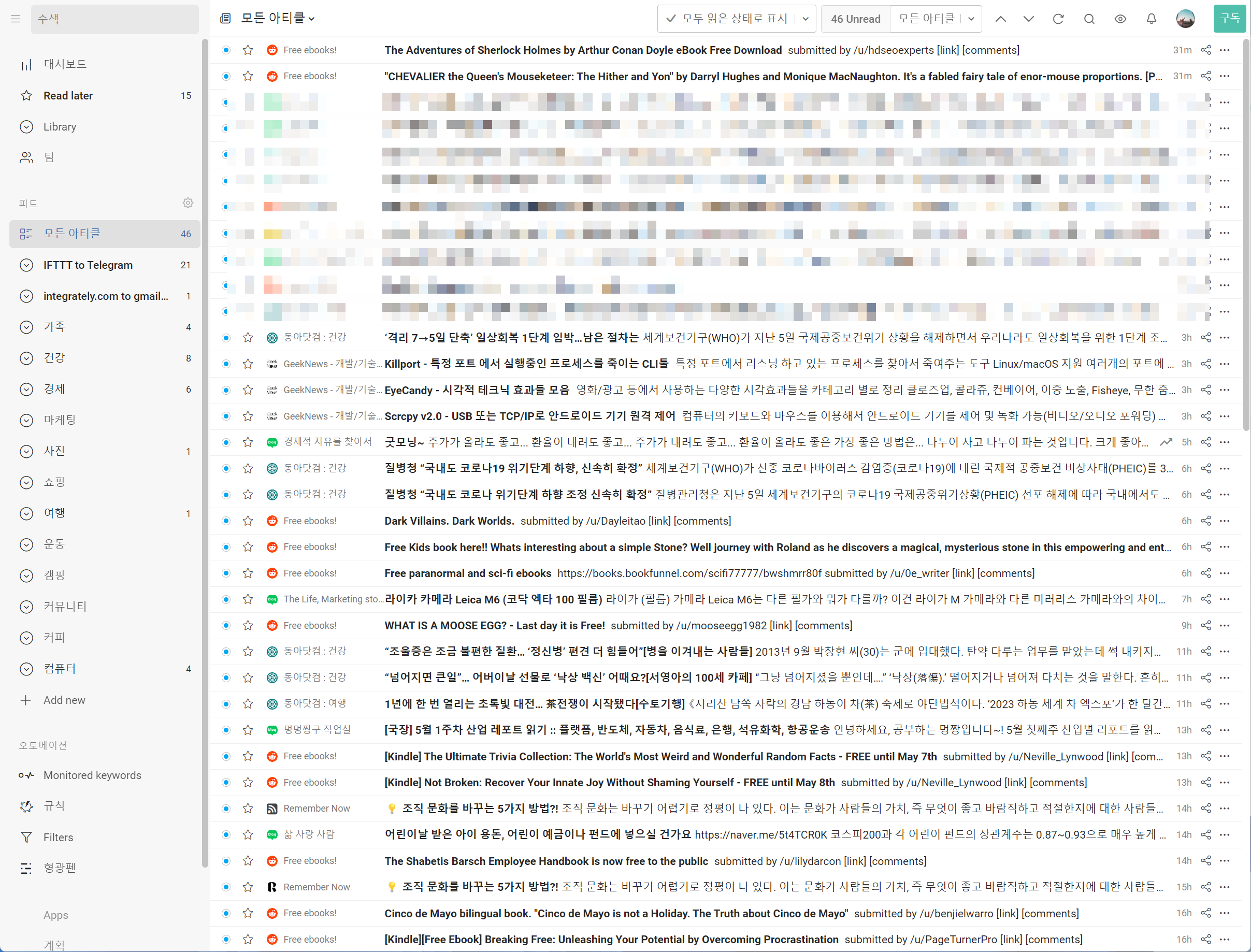 PC와 모바일에서는 아이노리더로 글을 읽고 있다. rss 정리 및 추가는 피들리닷컴을 사용한다.