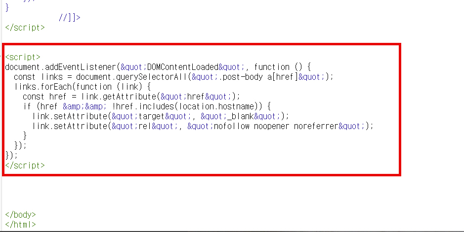 아래 코드를 테마 제일 하단의 </body> 바로 앞에 삽입하면 본문의 모든 링크는 새창으로 클릭된다.