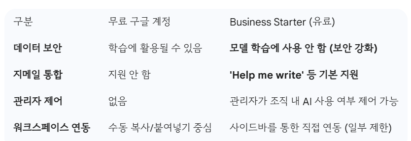 구글 무료계정과 워크스페이스 계정의 제미나이 사용 시 차이점