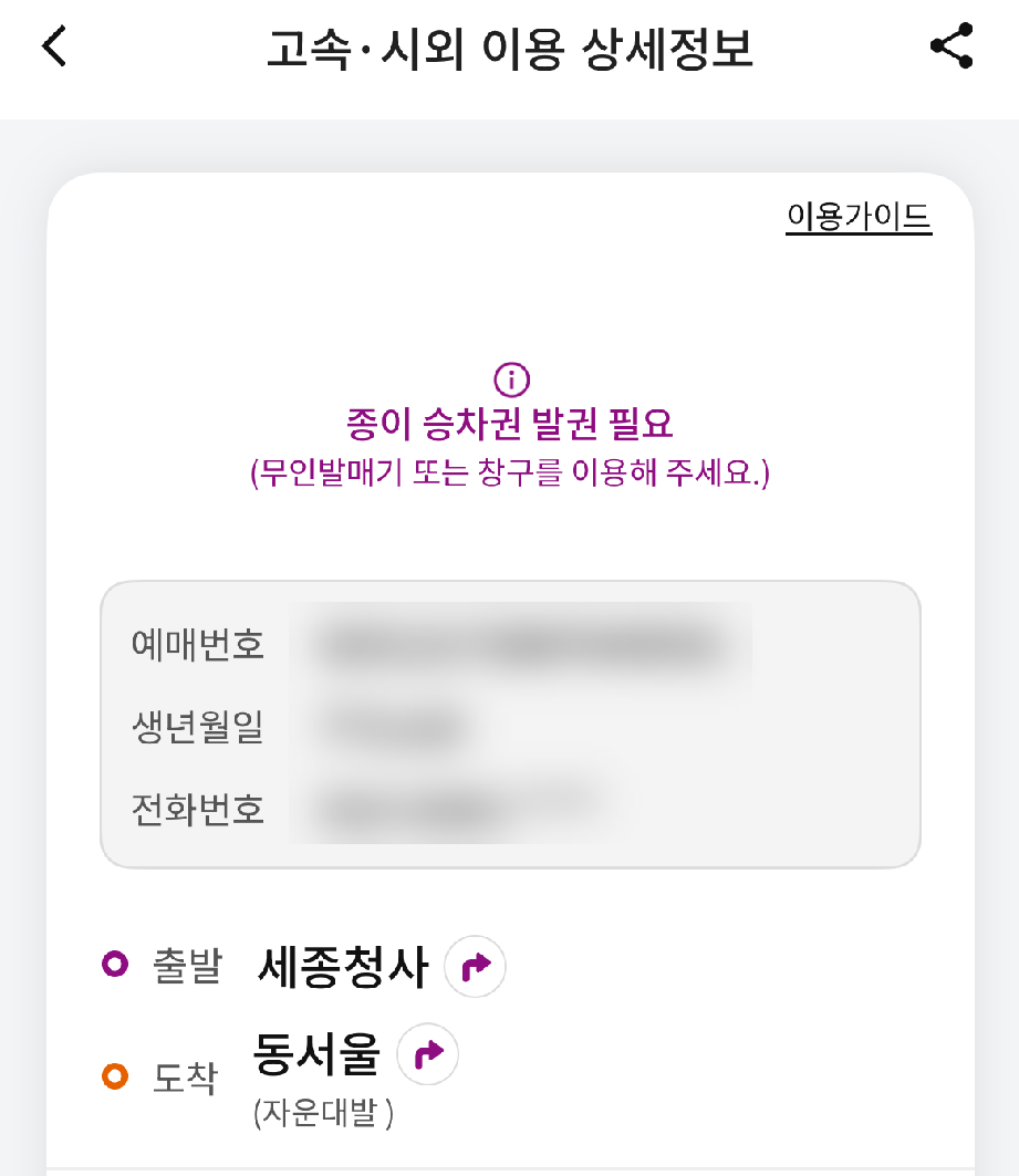 확인 방법은 예매를 하고 실제 예매 내역을 터치하여 탑승 과정을 실행하면 아래처럼 '종이 승차권' 안내 메시지를 볼 수 있다.