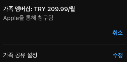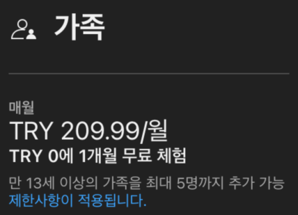 튀리키예의 유튜브 프리미엄 가족 요금제는 210 TRY다.