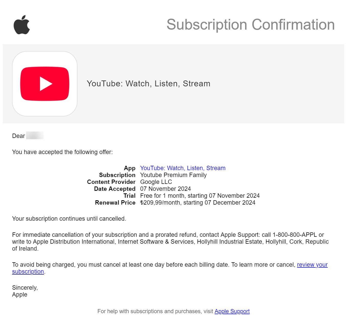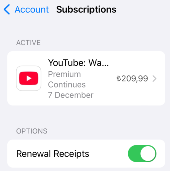 결제 및 취소: 멤버십 결제는 Apple에서 처리합니다. Apple에서 주문 확인 및 결제 세부정보가 포함된 이메일을 전송합니다. 무료 체험을 이용한 경우 체험 기간이 종료되면 Apple에서 자동으로 TRY 209.99/월 및 관련 세금을 청구합니다. Apple ID 계정 설정에서 언제든지 YouTube Premium 멤버십을 취소하실 수 있습니다. 부분 환불은 제공되지 않습니다. 환불 정책