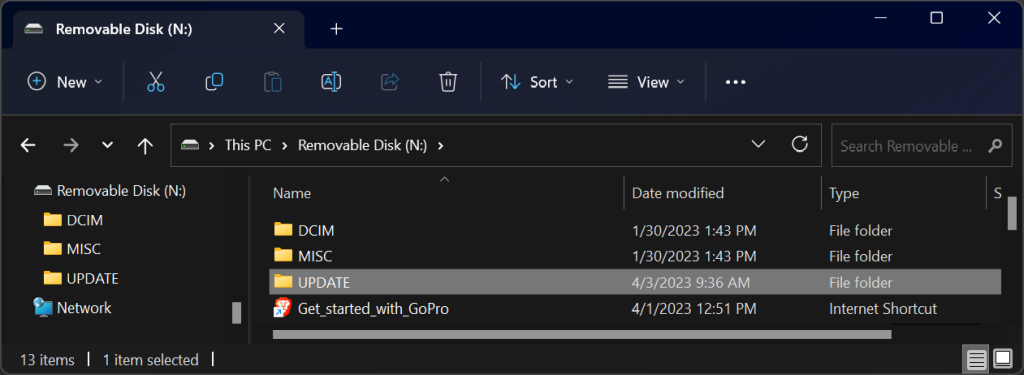 - 참고: UPDATE 폴더에는 CAMFWV.bin, DATA.bin 및 FWUPD.txt(또는 이와 유사한) 세 개의 파일이 포함됩니다.