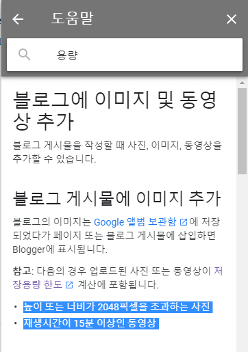 블로거닷컴 도움말에서 "용량"으로 검색을 하면 관련 도움말을 찾을 수 있다.